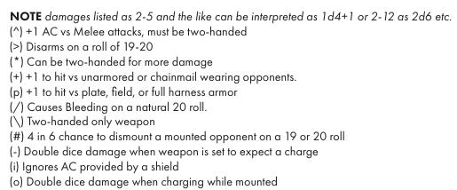 We’re almost done, so, equipment time! I get 3-18 silver pieces…. I roll a perfectly average 10. I also start with a weapon of my choice. The table is a little confusing… a lot of weapons have damage listed as 1-8(1-10). Based on the specific weapons, I am guessing the second number is 2-handed damage… and a little more checking reveals, that, yes, if the weapon name is followed by (*), it means “can do more damage if wielded 2-handed”. There are a lot of little marks next to weapons.